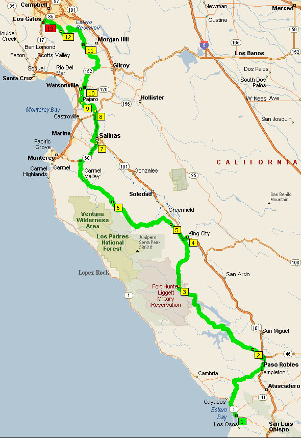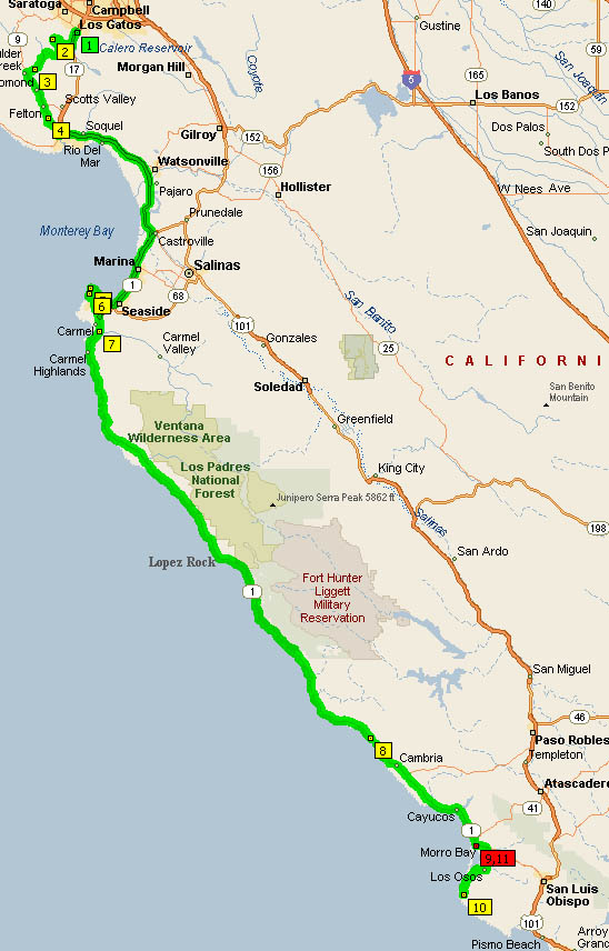 We'll leave the coast line and move on up into the hills. Up some back roads to get to Paso Robles where we'll jump onto Nacimiento Road (G14) which runs along the edges of Fort Hunter Liggett Miltary Reserve along lonely sweeps and light twists. Then we'll run along the incredibly secluded Carmel Valley Rd. back into "civilzation". We'll avoid major freeways by zig-zagging up to Watsonville where we'll cross Hecker Pass (Hwy 152). We'll finish up on some backroads into Los Gatos (probably) - at least as back road as you can get in San Jose.