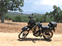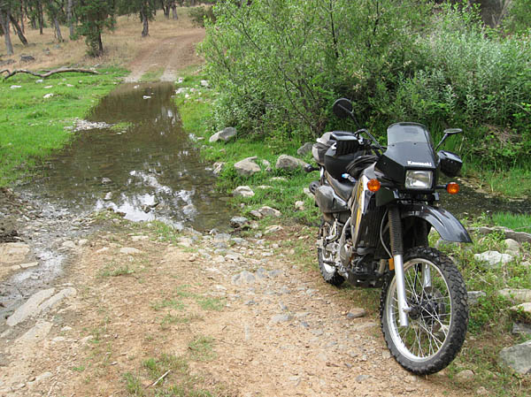Just around the first bend was a dry creek crossing. No water but lots of fist sized and smaller river rocks used to line the bed of the crossing. Slowed way down, stood on the pegs and crossed carefully with no problems. Continued on down the ol' dirt road. [PIC]