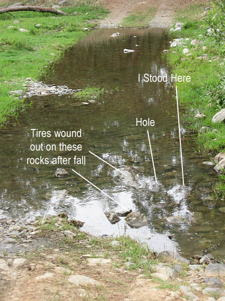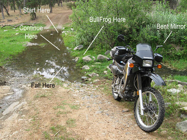 So I rested a minute and assessed the situation: I'm knee deep in the water, holding my shut off KLR that is hub deep in the water with me, I'm pretty sure that in my panic actions I didn't allow the important bits and pieces to submerge and suck in water, I think, I hope.